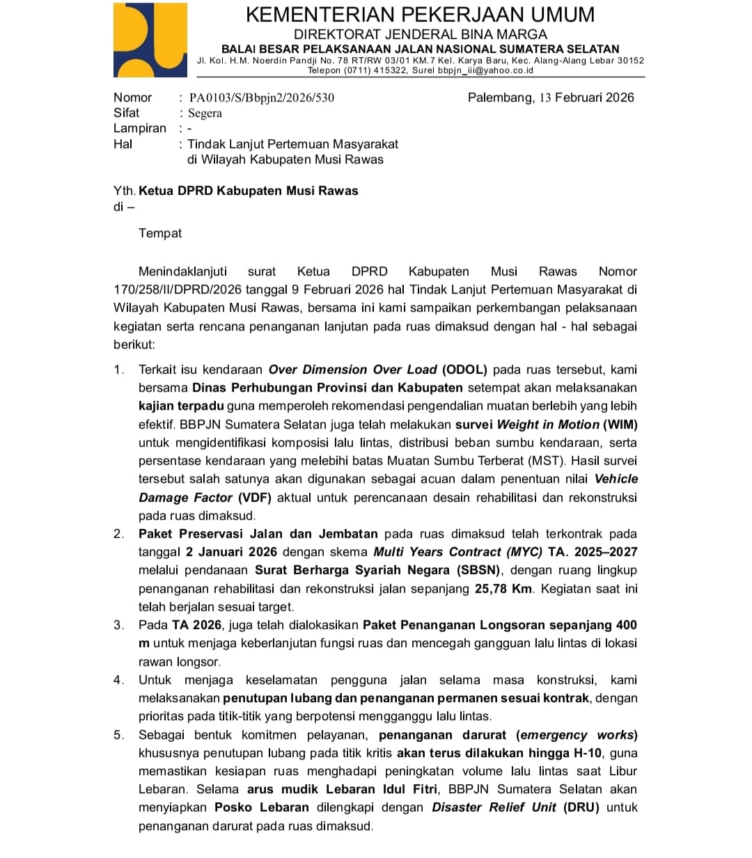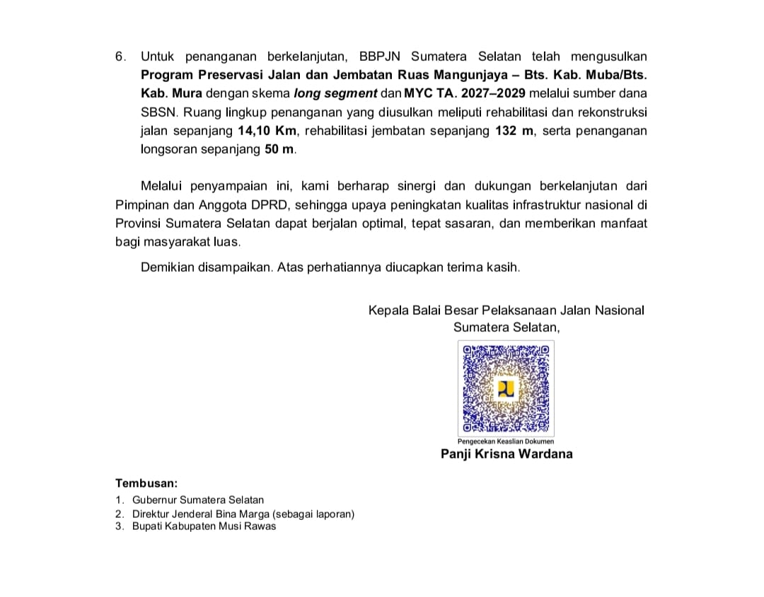 Menurut Mantan Ketua APDESI Mura ini bahwa hanya berselang beberapa hari setelah saya melayangkan surat resmi (Nomor: 170/258/DPRD/2026) kepada kementerian terkait, kemarin telah menerima jawaban resmi dari Balai Besar Pelaksanaan Jalan Nasional (BBPJN) Sumsel.