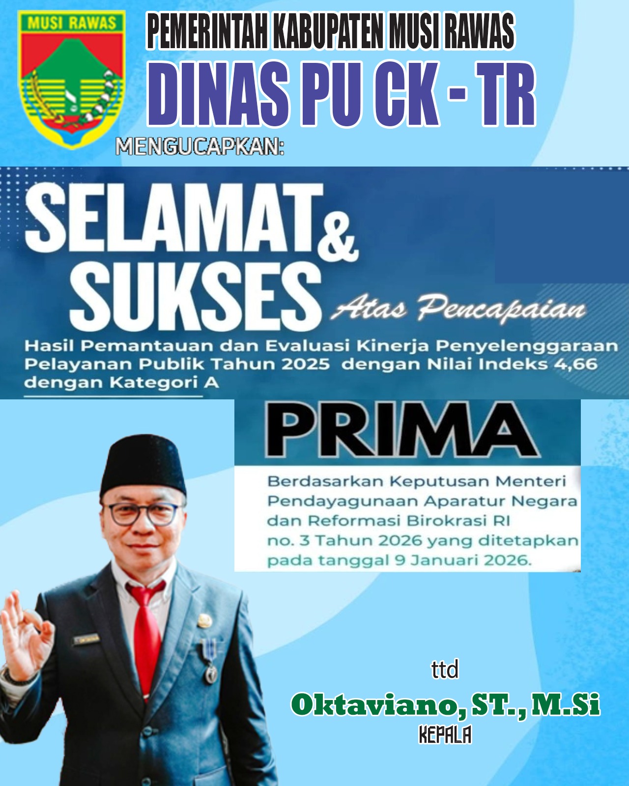 BERITASILAMPARI.COM– Dinas Pekerjaan Umum Cipta Karya, Tata Ruang dan Pengairan (PUCK-TRP) Kabupaten Musi Rawas mengucapkan selamat atas pencapaian hasil pemantauan dan evaluasi kinerja penyelenggaraan pelayanan publik tahun 2025 dengan nilai indeks 4,66 dengan kategori A Prima berdasarkan keputusan Menteri Pendayagunaan Aparatur Negara dan Reformasi Birokrasi RI no 3 Tahun 2026.