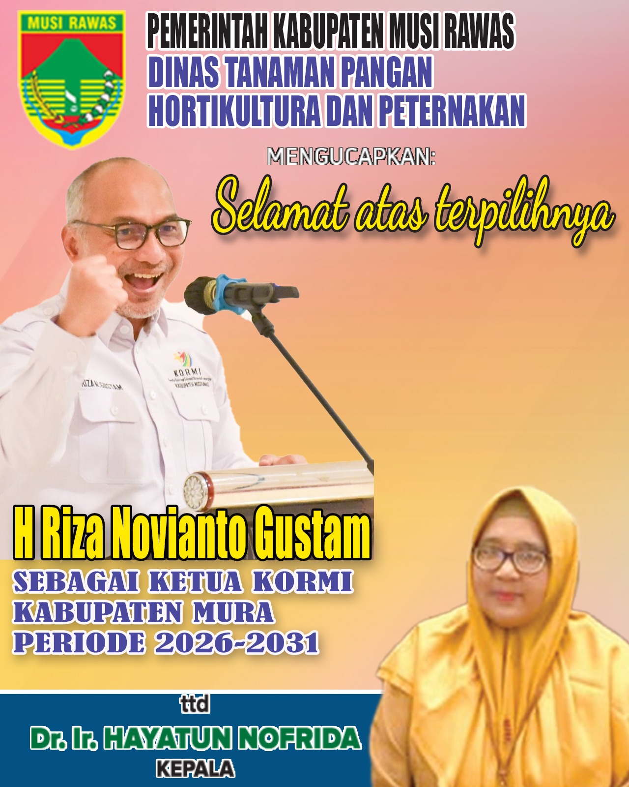 DTPHNAK Kabupaten Musi Rawas Mengucapkan atas terpilihnya H Riza Novianto Gustam sebagai Ketua KORMI Kabupaten Mura periode 2026-2031