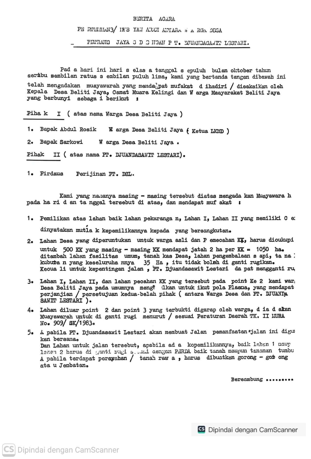 MUSI RAWAS- Perwakilan warga Desa Beliti Jaya Kecamatan Muara Kelingi Kabupaten Musi Rawas (Mura) yang tergabung dalam Forum Masyarakat Penyelamat Lahan mendatangi PT Djuanda Sawit Lestari (PT DSL). Kedatangan mereka untuk menanyakan tindak lanjut atas kesepakatan yang telah dibuat 31 tahun yang lalu antara pihak perusahaan bersama warga tepatnya pada 10 Oktober 1995.