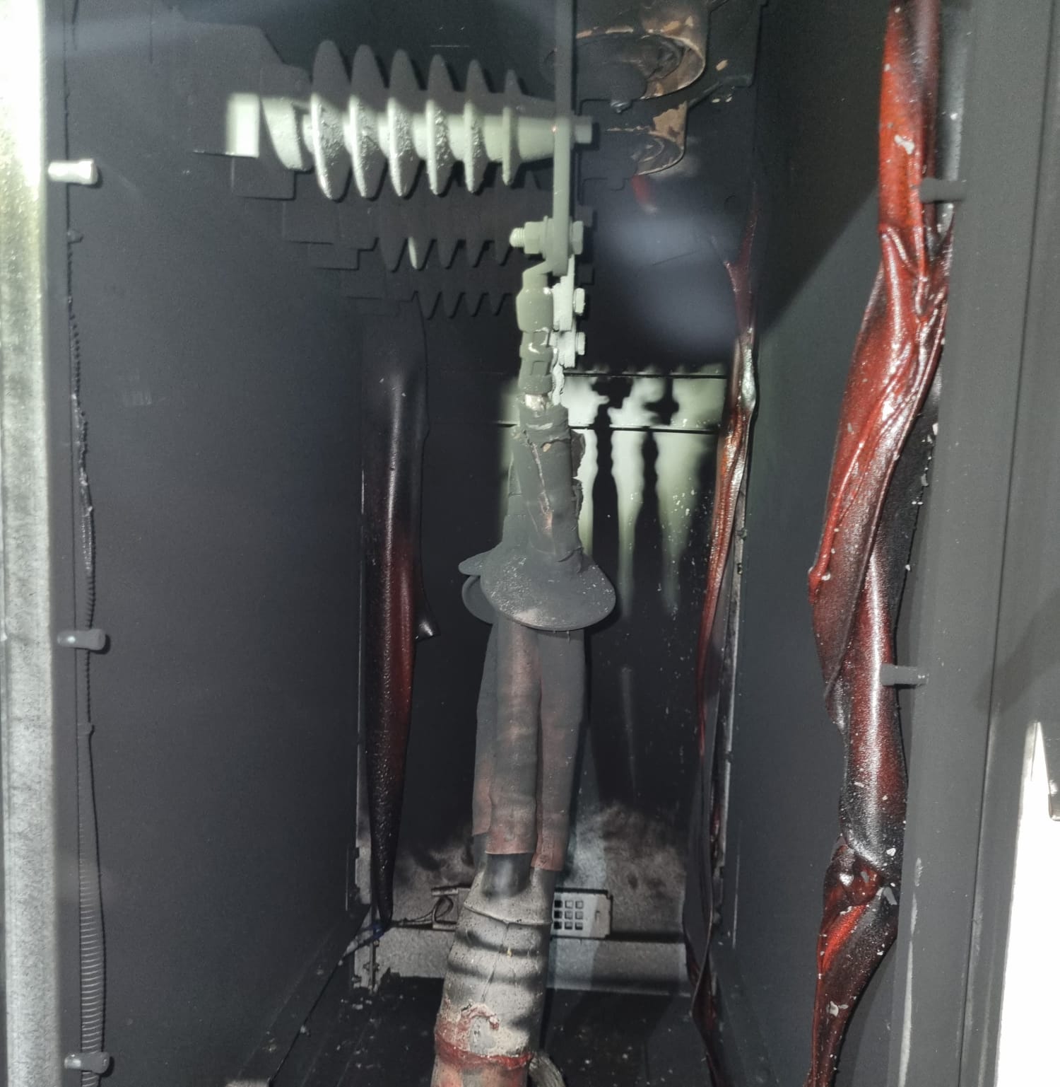 Kondisi kubikel (panel hubung bagi) di gardu hubung Muara Beliti yang meledak.