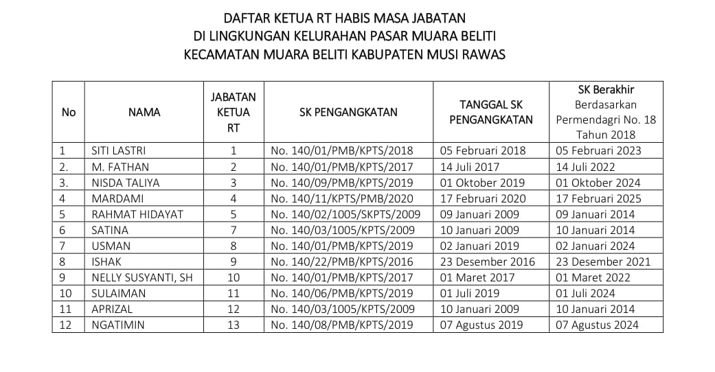 MUSI RAWAS- Dari 13 Ketua Rukun Tetangga (RT) di Kelurahan Pasar Muara Beliti Kecamatan Muara Beliti, 12 diantaranya telah habis masa jabatan berdasarkan Peraturan Menteri Dalam Negeri (Permendagri) No 18 Tahun 2018 tentang Lembaga Kemasyarakatan Desa (LKD) dan Lembaga Adat Desa (LAD) dimana masa jabatan RT selama 5 (lima) tahun terhitung sejak tanggal ditetapkan.