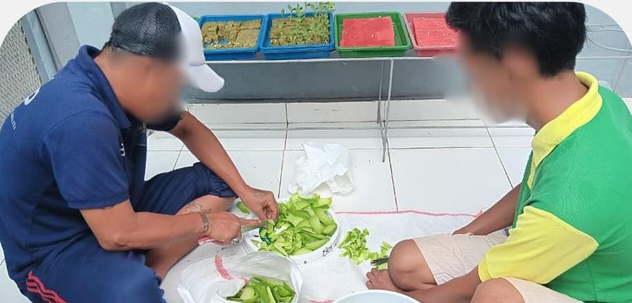 Proses pembuatan pupuk kompos melibatkan warga binaan di bawah pengawasan petugas, sekaligus menjadi sarana edukasi tentang pengelolaan sampah dan kepedulian terhadap lingkungan.