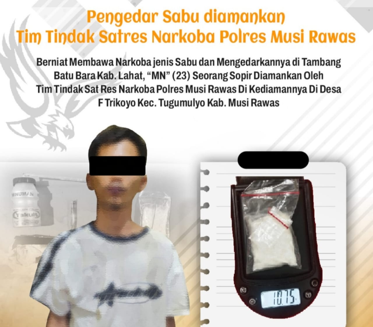 Kapolres Kabupaten Mura, AKBP Agung Adhitya Prananta didampingi Kasatres Narkoba Polres Musi Rawas IPTU Jemmy Amin Gumayel membenarkan bahwa adanya kegiatan penangkapan Pelaku yang diduga sebagai Pengedar Narkoba jenis sabu di Desa F Trikoyo.